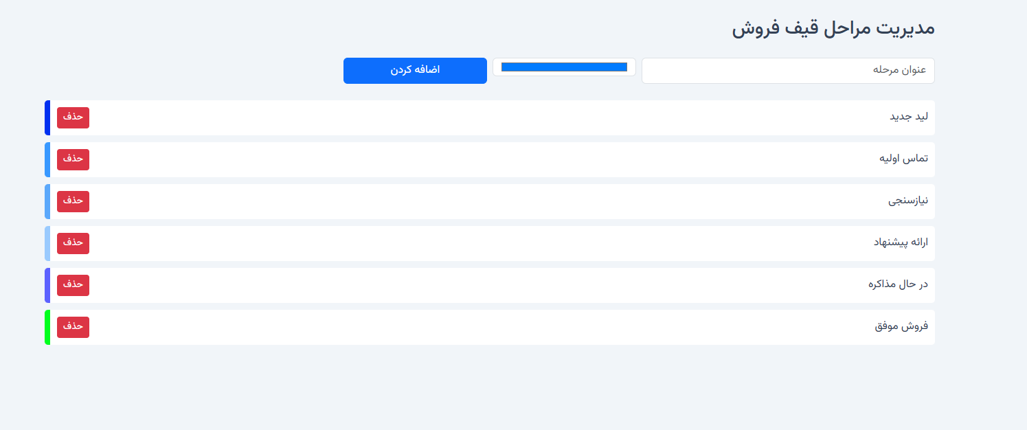 در CRM رشد، شما میتوانید مراحل قیف فروش را بهصورت سفارشی تعریف کنید.